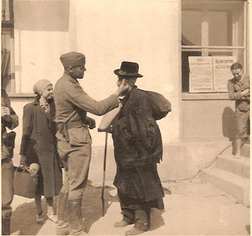 Observant Jewish woman staring on as a Hungarian officer viciously cuts off her husband’s beard – in the spring of 1944 in the ghetto.