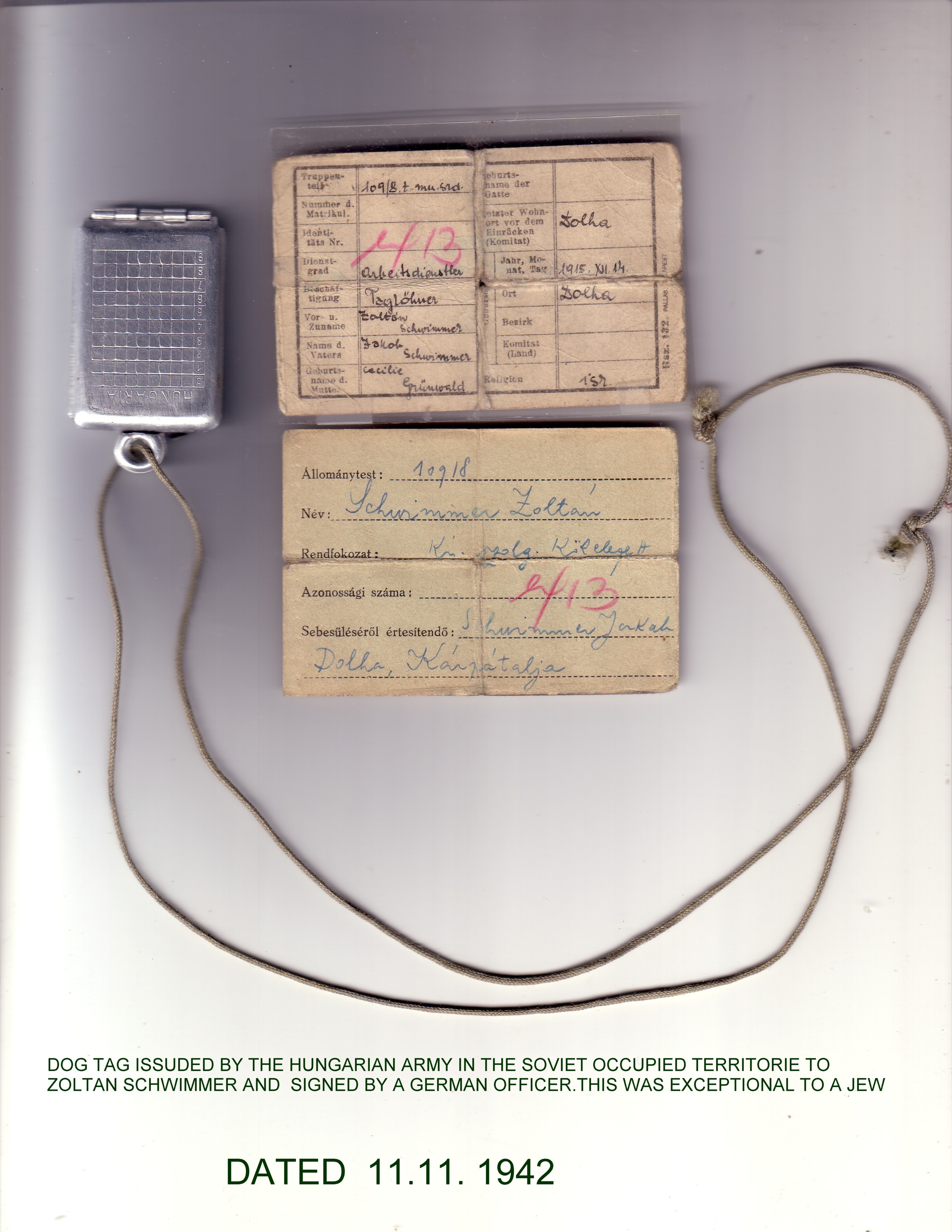 Figure 3 : Dog Tag issued by the Hungarian army in the Soviet occupied territory to Zoltan Schwimmer and signed by a German officer. This was exceptinal for a Jew. Dated 11.11.1942